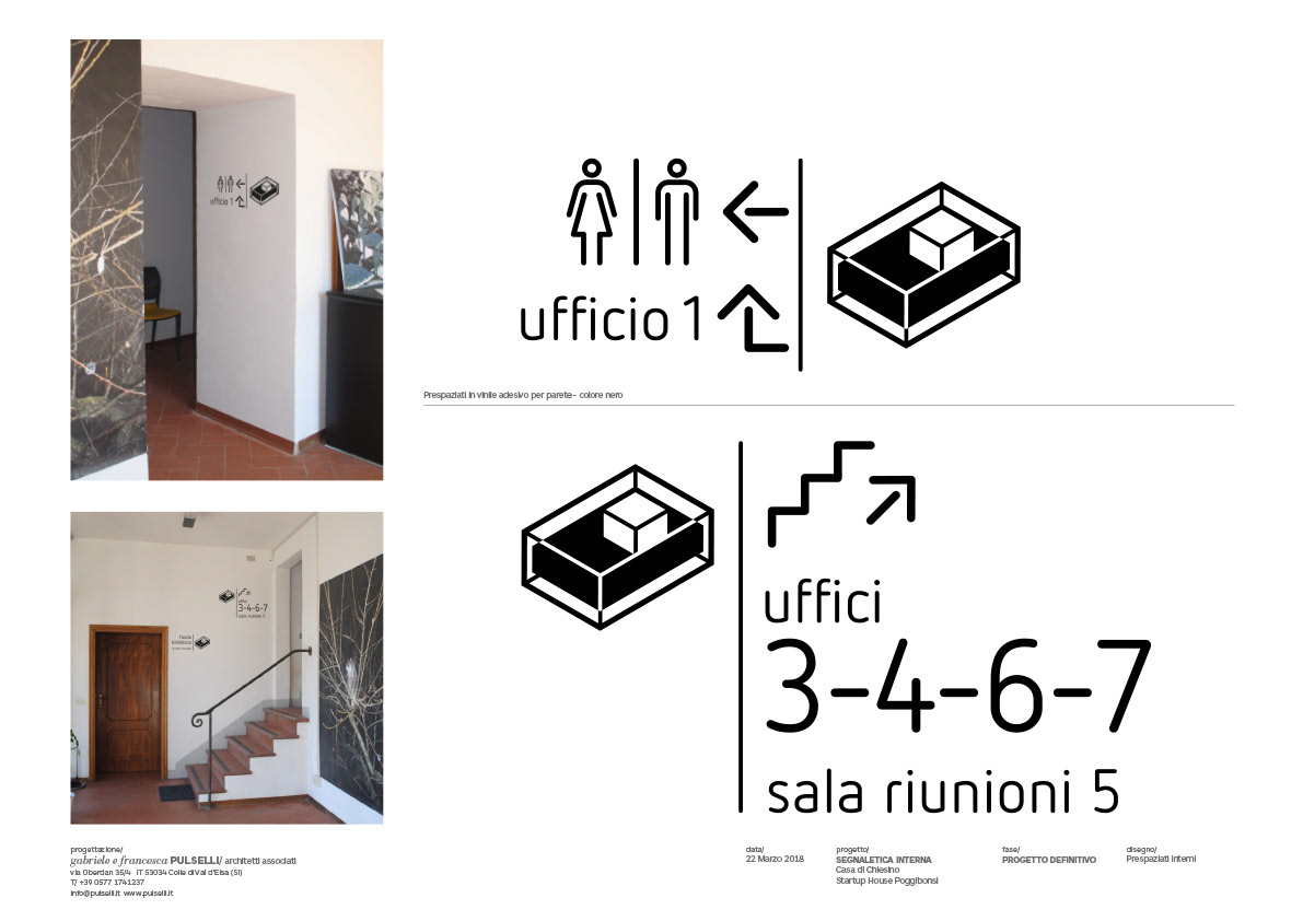 Il Comune di Poggibonsi, con la collaborazione di Terre di Siena LAB ha realizzato una Startup House per le imprese giovani e innovative del territorio nella ex-sede della biblioteca comunale. La Casa di Chesino è un edificio storico presente nel catasto leopoldino promulgato nel 1765. La sua struttura rispecchia quella delle case coloniche solide e salubri volute da Pietro Leopoldo Granduca di Toscana e che diventarono il nuovo modello dell'abitazione rurale e simbolo di un nuovo rapporto tra lavoro agricolo e esigenze abitative. Il progetto del marchio e della segnaletica interpreta le forme lineari e razionali della casa colonica: un parallelepipedo regolare sormontato dal corpo della colombaia. Il risultato è un volume che "contiene" e ospita un "pieno" che idealmente rappresenta il concetto di incubatore d'impresa. La sua rappresentazione assonometrica e gli assi cartesiani esprimono l'indirizzo e la prospettiva di sviluppo che il progetto Startup vuole dare a sostegno del mondo imprenditoriale locale.