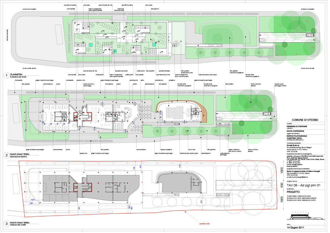 Il mantenimento della struttura vegetale del lotto se non addirittura la sua implementazione è in realtà una vera e propria esigenza di tutto il contesto fortemente urbanizzato. Questo bisogno primario di natura, seppur artificiale, che ha origini molto antiche, è strettamente connessa alla condizione umana dell'abitare. In città la mancanza di spazi adeguati ha portato all'esplorazione di nuove soluzioni e all'adozione di sistemi che sfruttano non solo il suolo, ma anche la copertura e le pareti degli edifici. Il progetto ipotizza un sistema di verde complesso, sia pubblico che privato fatto di giardini pensili sul tetto e verticali sulle facciate, superfici vegetate in copertura dei parcheggi e dell'auditorium possono essere efficaci strumenti per l'integrazione tra natura coltivata e architettura urbana.