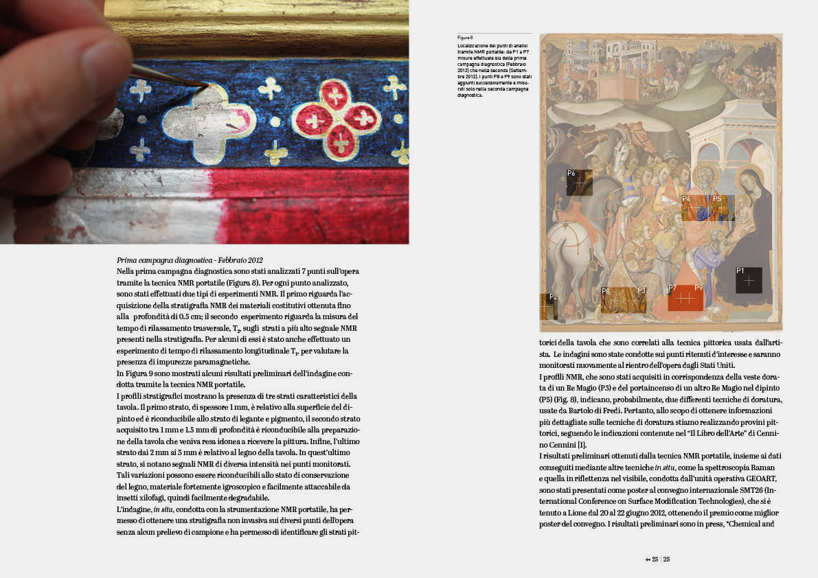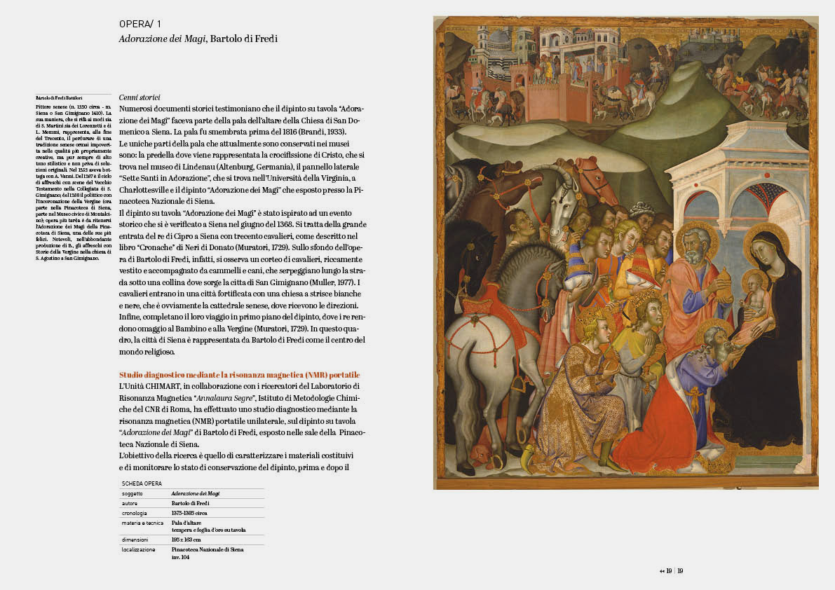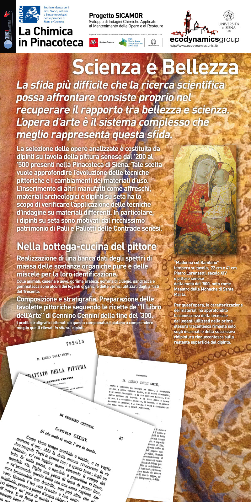 Nel progetto sono stati coinvolti diversi gruppi di ricerca con esperienze consolidate su un ampio spettro di tecniche chimiche, chimico fisiche e geochimiche. L’integrazione di queste competenze e la disponibilità di utilizzo degli strumenti presenti nelle sedi dei diversi Dipartimenti universitari interessati costituiscono la base di partenza sulla quale sperimentare nuove metodologie di approccio nel settore dei Beni Culturali. Con l'impiego della Time of Flight Ion Mass Spectrometry (ToF-SIMS) e la spettroscopia di risonanza magnetica nucleare (Nuclear Magnetic Resonance, NMR), il progetto di ricerca SICAMOR. sviluppa una metodologia innovativa d'indagine dei manufatti artistici basata sull’uso combinato di queste tecniche sensibili per la messa a punto di un intervento di restauro di alcune opere pittoriche su tavola della scuola senese tra cui l'Adorazione dei Magi di Bartolo di Fredi.